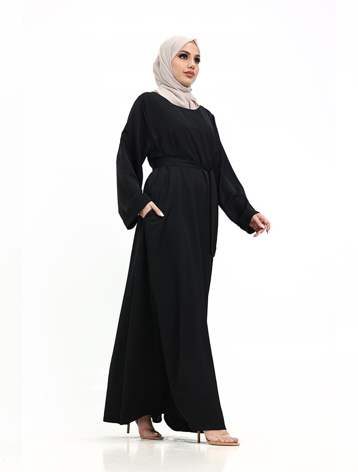 This abaya embraces a minimalist design, prioritizing everyday comfort without compromising on style. It showcases an A-line silhouette with a flared hem and convenient side pockets for your essentials. Additional features include wide sleeves finished with cuffs, and a detachable belt that allows you to choose between a relaxed fit or a more defined, structured look.