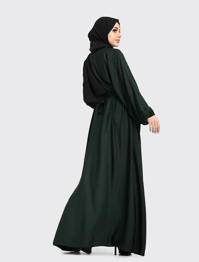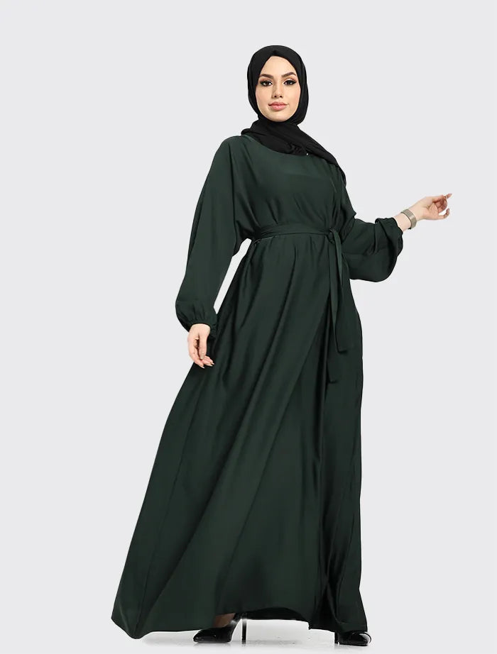 This essential abaya offers the ideal blend of simplicity and daily comfort. It features a flowing A-line design with a flared hem, side pockets for practicality, and elasticated cuffs that create a gentle puffed sleeve detail. Complete with a removable belt, you can style it for a polished silhouette or wear it loose for an effortlessly casual vibe.