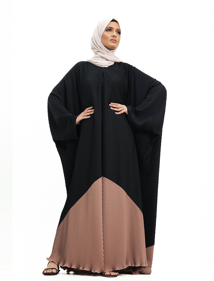 This batwing abaya is styled with a V-neckline and offers a modest, uncomplicated look. It’s designed with gentle pleating and a loose, flowing fit, making it a comfortable choice for everyday wear.