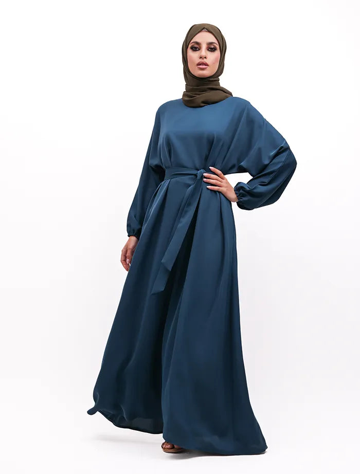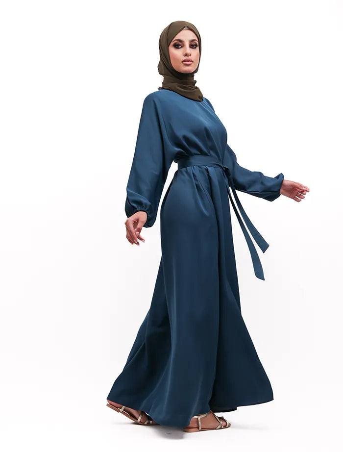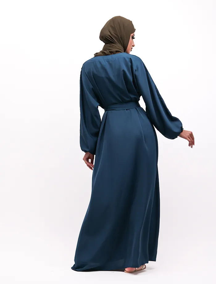 This simple yet stylish abaya is a versatile choice for everyday wear, offering both comfort and ease. It’s tailored with an A-line cut and a flared hem, providing a flattering silhouette. Functional side pockets add practicality, while the elasticated cuffs give the sleeves a gentle puffed detail. It also includes a removable belt, allowing you to switch between a more defined shape or a relaxed, casual fit.