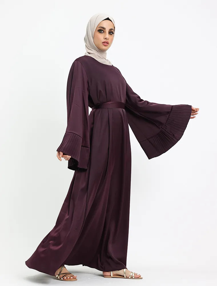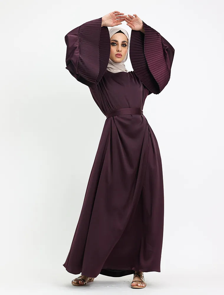 Crafted from smooth satin, this abaya features a round neckline and is designed for both style and everyday comfort. Its A-line silhouette flows into a graceful flared hem, complemented by pleated cuffs for an elegant touch. With practical side pockets and a removable belt, you can choose between a relaxed or more structured look depending on your preference.